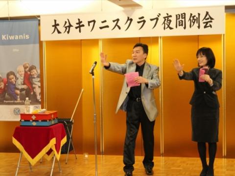 2014年3月18日に第3回夜間例会(第119回)をホテルザーズで開催しました。例会前には役員会を行い、今後のスケジュールや改善点を話し合いました。今回の例会の途中には大分県を拠点に全国各地のパーティーやイベントで活躍中のマジシャン大江戸ジュリさんに来ていただき、笑いや驚きを届けていただきました。